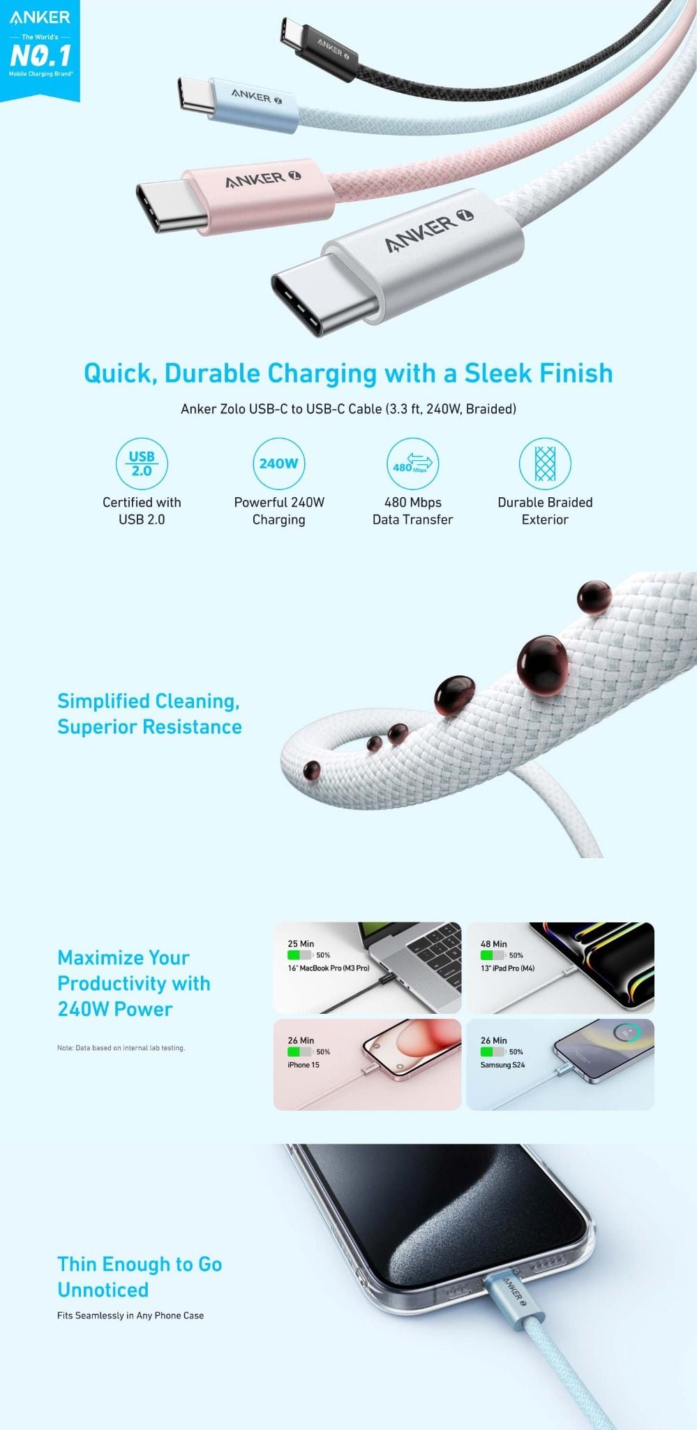 Sạc siêu tốc 240W: Cáp Anker Zolo cung cấp công suất lên đến 240W, giúp sạc nhanh chóng các thiết bị công suất cao. Chỉ trong 25 phút, bạn có thể sạc 50% cho MacBook Pro 16" (M3) và 48 phút cho iPad Pro 13" (M4), tiết kiệm thời gian đáng kể.