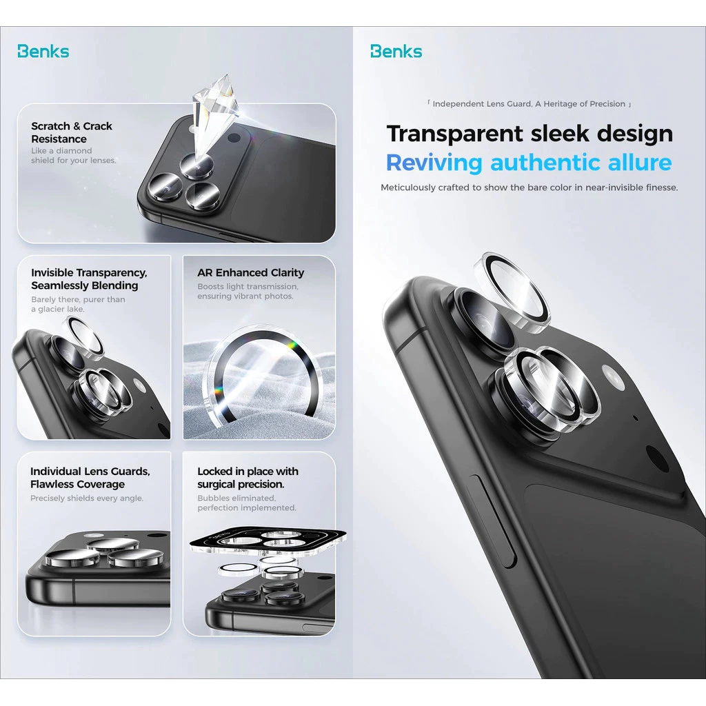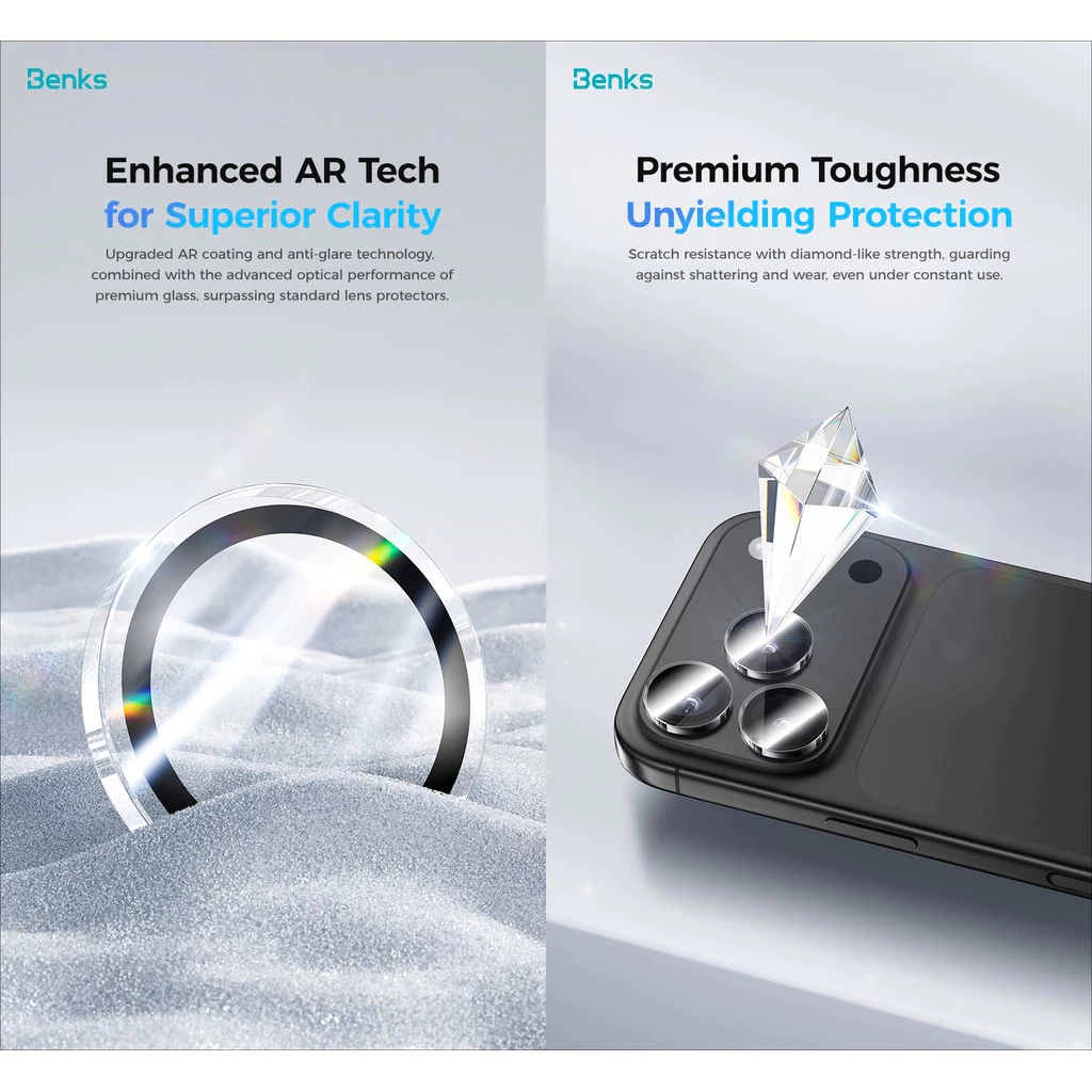 Bộ bảo vệ ống kính camera Benks được thiết kế chính xác cho từng ống kính riêng lẻ của iP 17 Pro và 17 Pro Max.