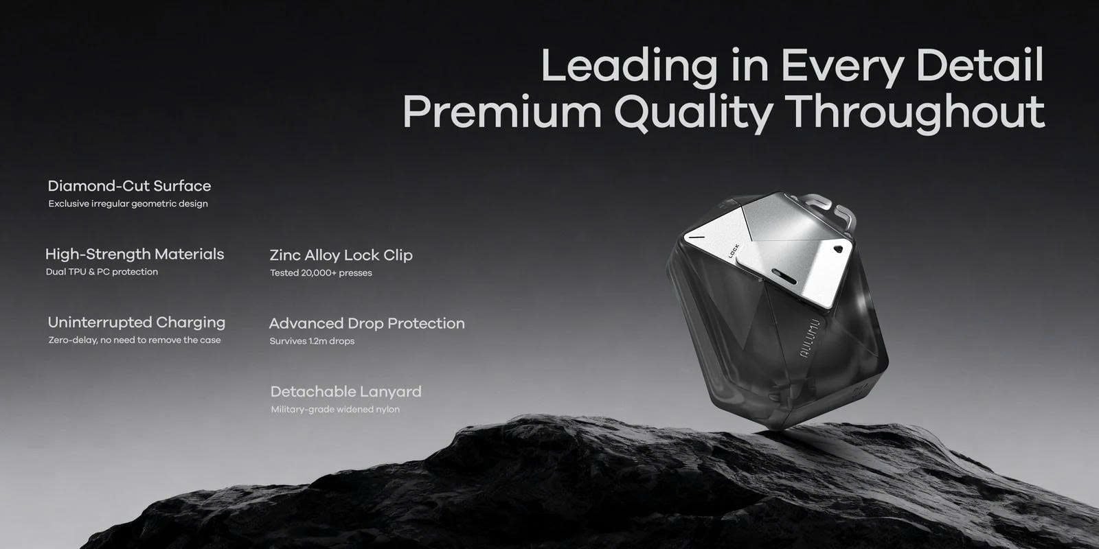 Tính năng: Chống sốc, chống rơi, chống trầy, sạc không dây, khóa bảo vệ + dây đeo