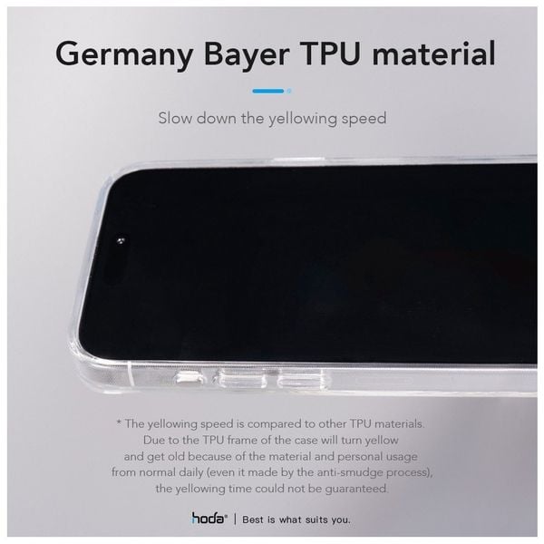 Một chất liệu có thể làm hạn chế quá trình ố vàng của chiếc ốp đó là chất liệu TPU cao cấp Bayer Đức. Đối với những chiếc ốp khác có trên thị trường thì trong quá trình sử dụng do ma sát và tiếp xúc với mồ hôi tay viền ốp dễ bị ố vàng theo thời gian nhưng riêng với chiếc ốp Hoda Crystal Pro này thời gian ố vàng sẽ được kéo dài hơn, giúp bạn an tâm, tự tin trong quá trình sử dụng.