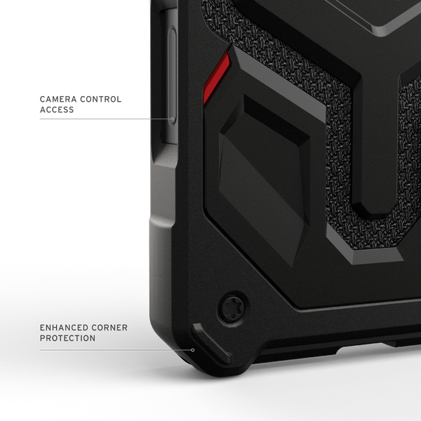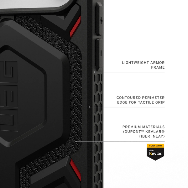 Chất liệu Đa lớp: UAG Monarch Pro MagSafe sở hữu cấu trúc đa lớp bao gồm lớp ngoài bằng polycarbonate chống va đập, lớp giữa bằng cao su hấp thụ sốc, và lớp bên trong bằng foam giảm lực va đập, cùng với khung kim loại gia cố.